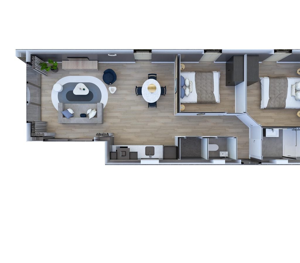 Vanuit de leefruimte bereikt u twee comfortabele slaapkamers, elk ontworpen als een rustige plek
